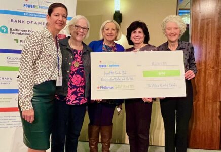 Leadership Team members accepted the award at the Philanos PowerUp conference in Baltimore. From left to right: Vice President Celeste Campos; Secretary and Governance Chair Suzanne Thoeni; President Debby Seme; Treasurer Irene Maroney; and Nonprofit Outreach Chair Louise Murray.